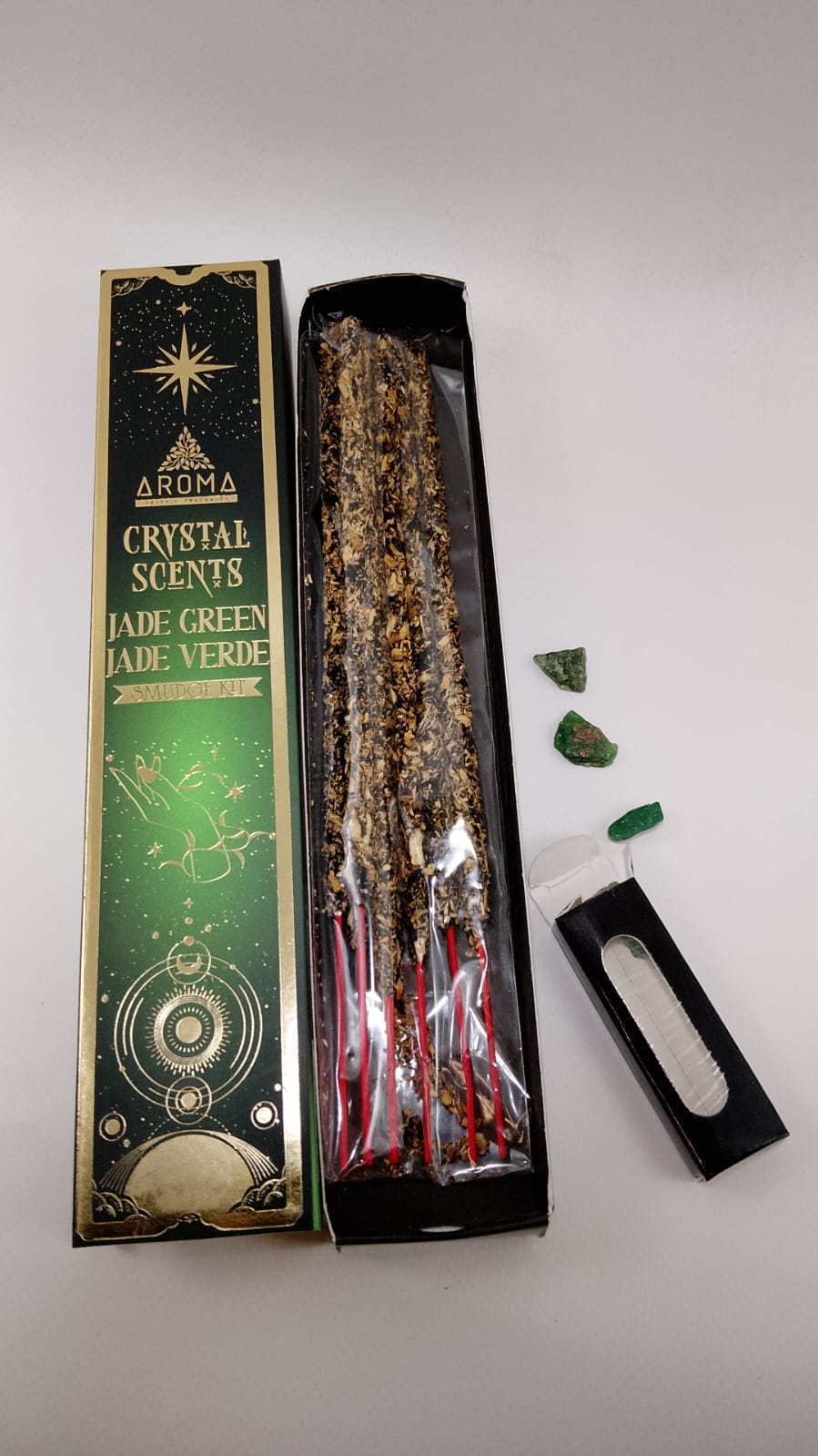 Humo Sagrado y Fortuna: Incienso de Jade Verde Eleva la vibración de tu espacio con la línea Aroma Crystal. Este incienso orgánico ha sido diseñado específicamente para limpiar las energías estancadas que impiden la llegada de la abundancia. Al contener trozos reales de jade, su humo actúa como un conductor de serenidad y buena suerte.