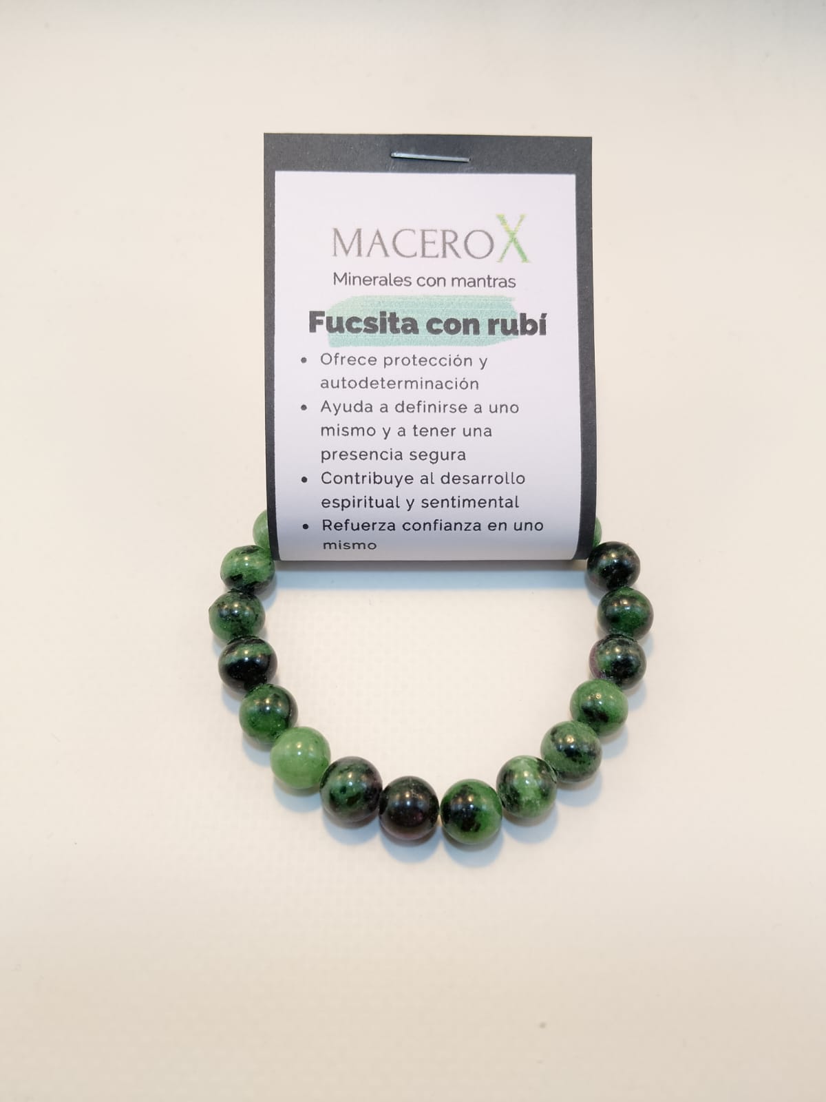 Pulsera de piedras elástica con mineral de Fucsita con Rubí en bolas de 8mm.