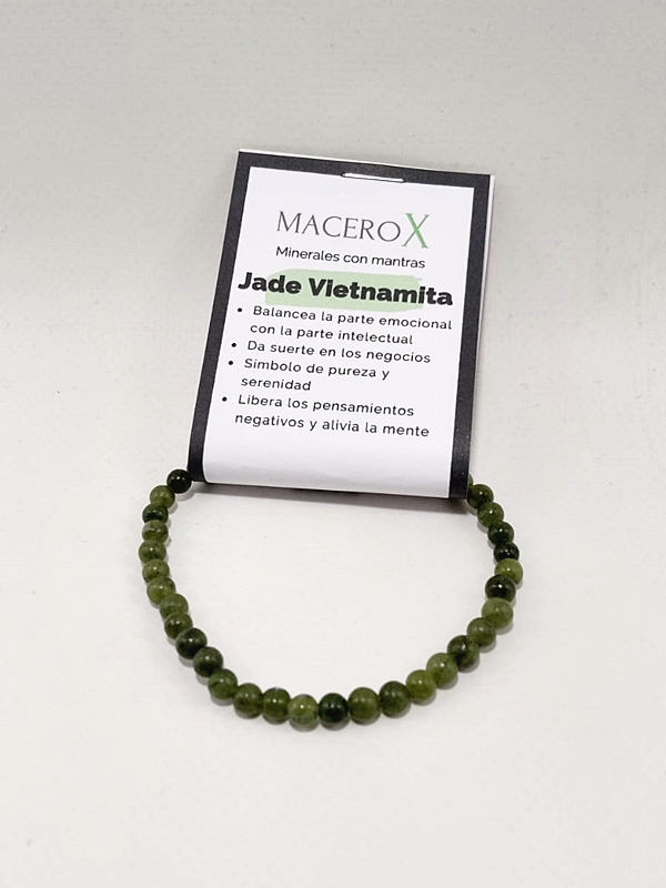 Sutileza y Éxito: Jade Vietnamita 4mm El Jade Vietnamita es apreciado por su energía vibrante y su conexión con la tierra. En este formato de 4mm, la pulsera se convierte en un discreto conductor de energía positiva, perfecto para llevar solo o en combinación con otros minerales de protección de nuestra tienda.