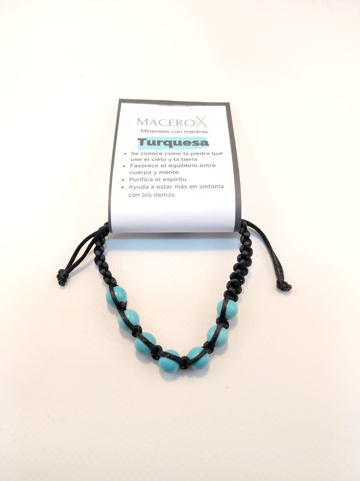 Pulsera de piedras con mineral de Turquesa en bolas de 8mm y cordón negro de hilo trenzado con nudo corredizo ajustable.