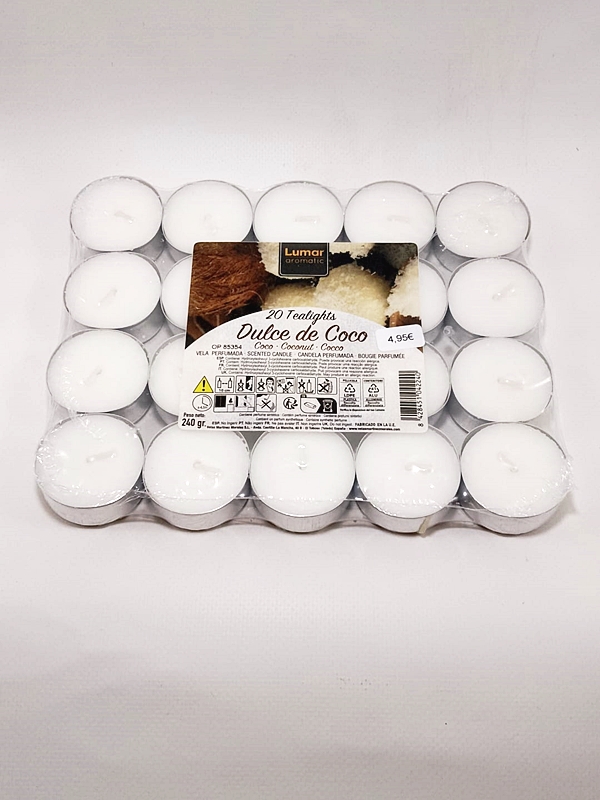 El Pack de 20 velas de té (tealights) con aroma a Dulce de Coco destaca por su fragancia suave pero persistente, que combina la frescura del coco natural con un fondo dulce y reconfortante. Es la elección perfecta para quienes buscan un aroma que evoque calma, bienestar y una sensación de vacaciones constantes en cualquier estancia de la casa.